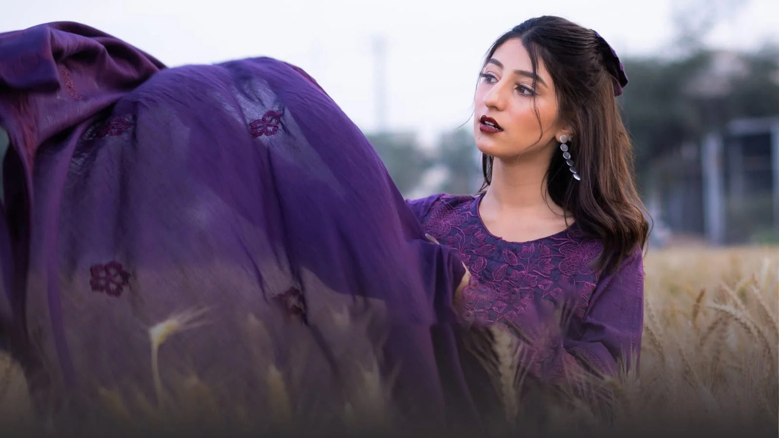 3 Piece Embroidered Suit – Unstitched with Gala, Bazu & Daman Work, Cotton Net Dupatta