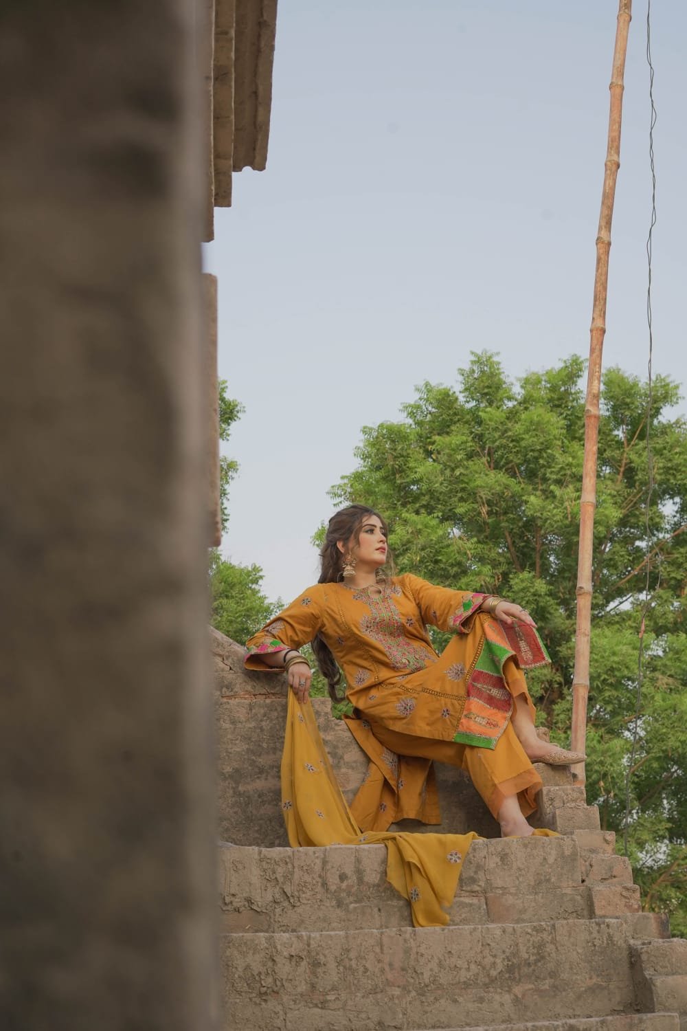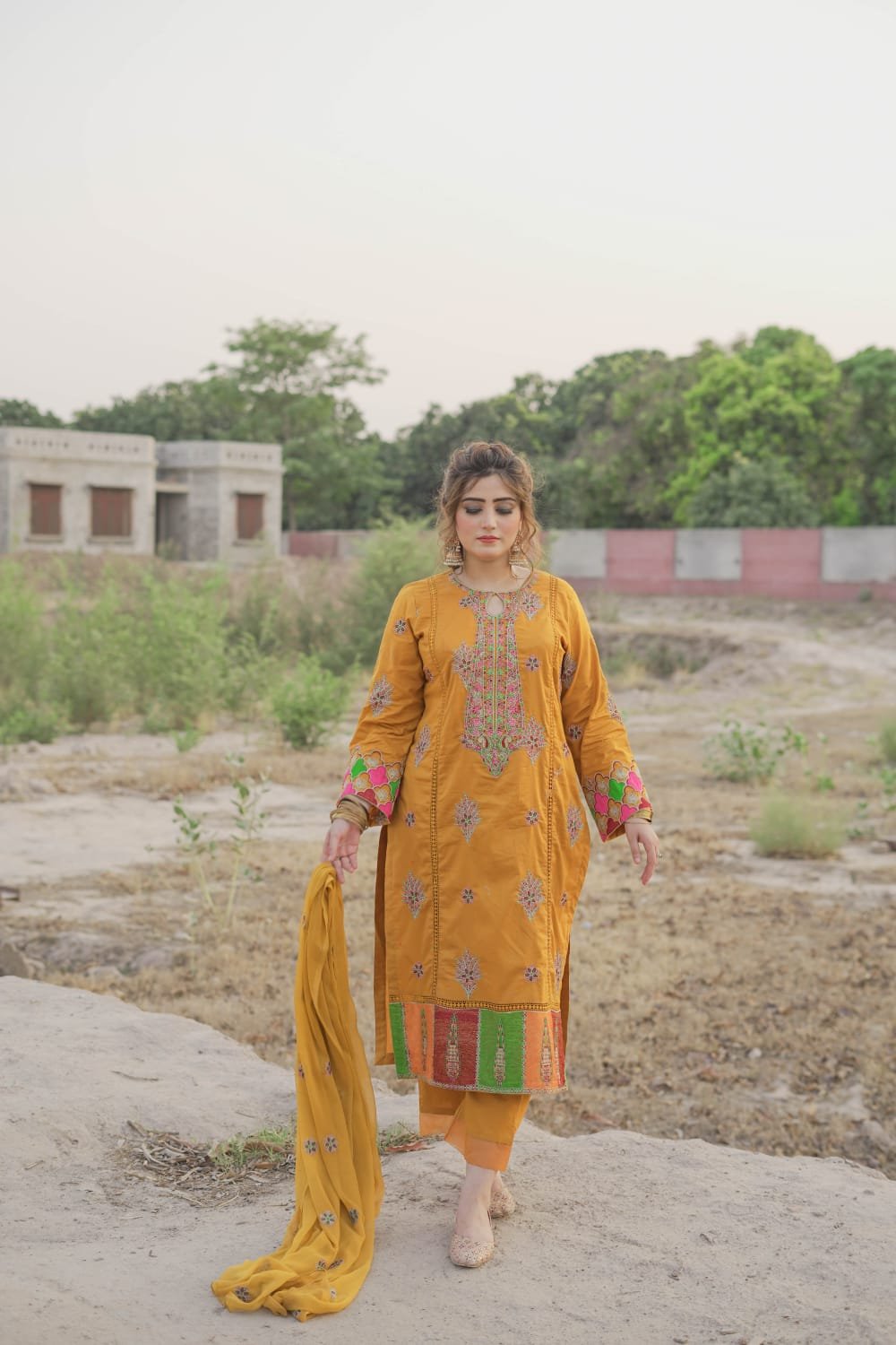 This Summer Collection 3-piece suit includes 2.5 meters of lawn fabric for the shirt and trouser, complemented by an elegant organza dupatta and a chiffon dupatta. Stylish and breathable, it’s perfect for warm weather.