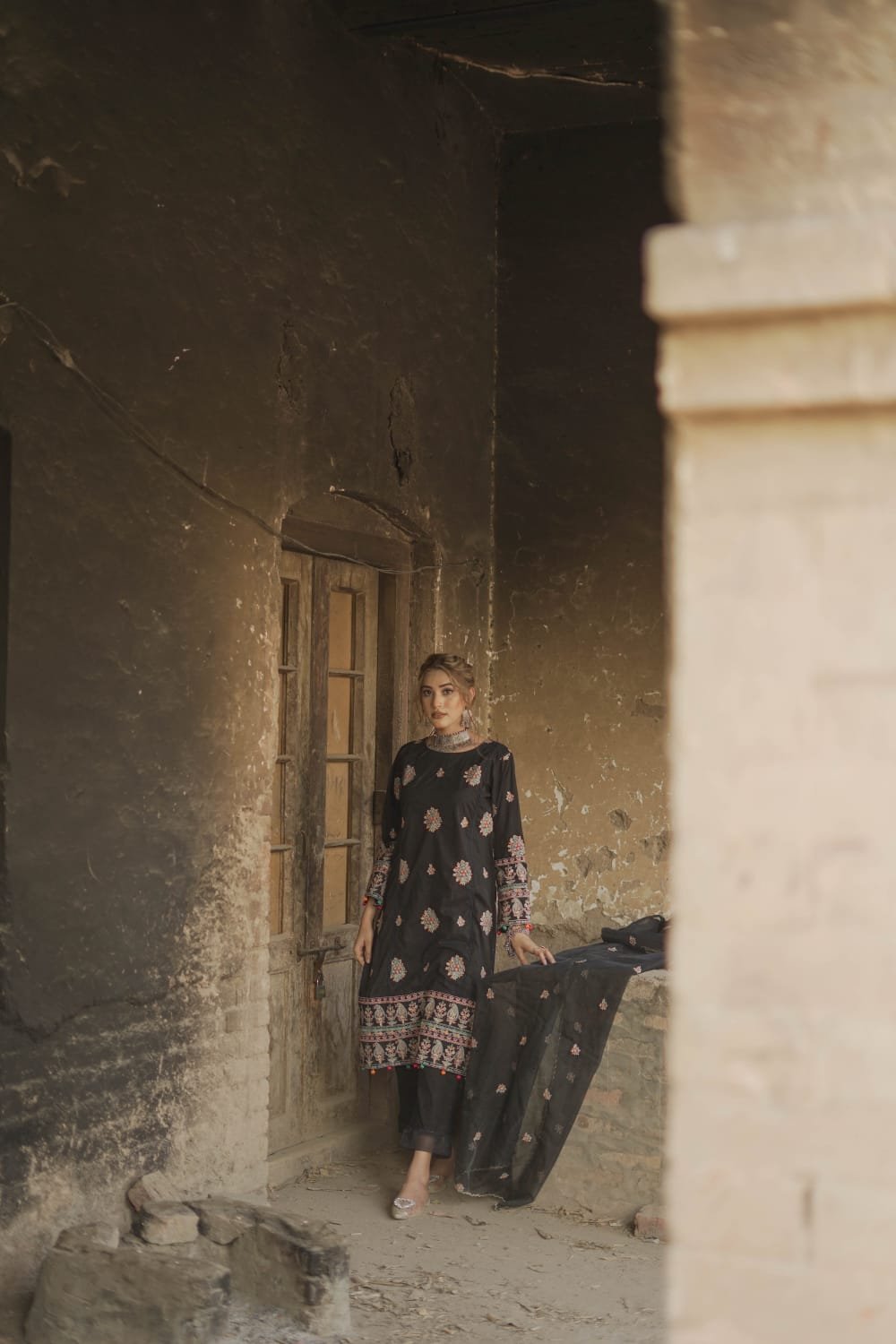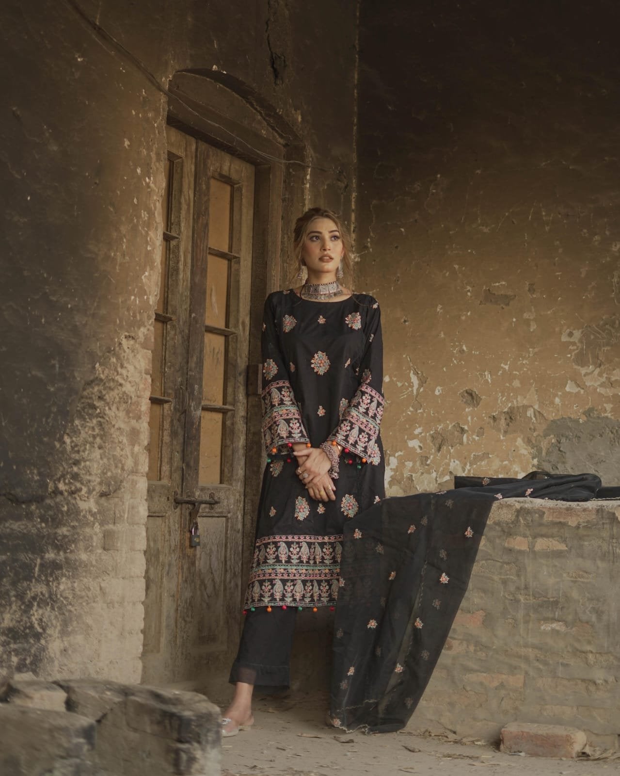 This unstitched 3-piece lawn suit in black features a 2.5-meter lawn shirt, 2.5-meter trouser, and an organza dupatta. Includes beautiful daman and sleeve patches, ideal for summer fashion/